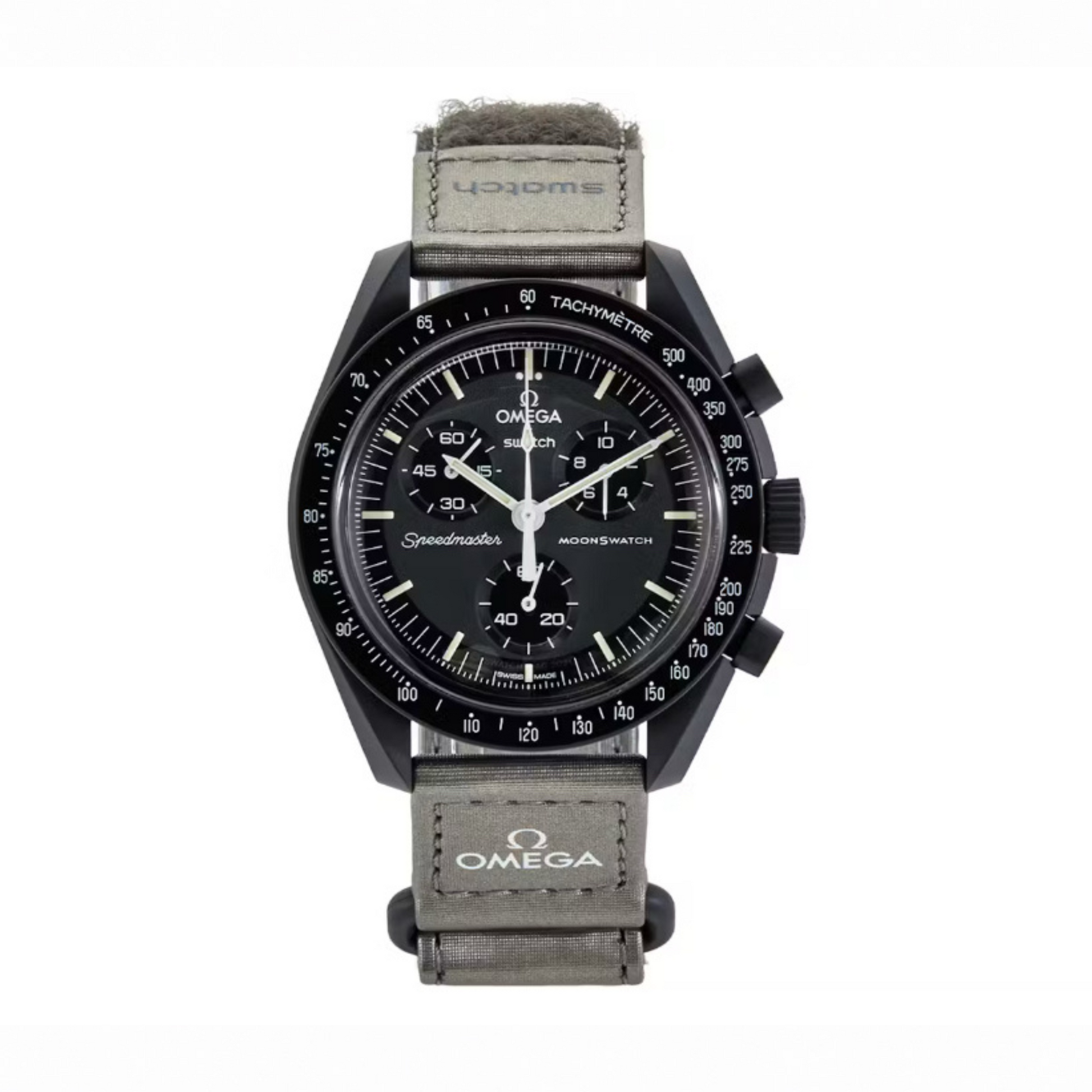 Με το έντονο βαθύ γκρίζο χρώμα και λουράκι VELCRO© σε μεταλλικό γκρίζο, αυτό το ρολόι δεν αστειεύεται. Ο δείκτης δευτερολέπτων του χρονογράφου, οι δείκτες των ενδείξεων χρονογράφου εντός του καντράν και η ταχυμετρική κλίμακα είναι σε λευκό χρώμα. Το φόντο των ενδείξεων χρονογράφου και της στεφάνης είναι μαύρο. Όλα τα καντράν φέρουν το logo OMEGA X Swatch, καθώς και το εμβληματικό λογότυπο Speedmaster και το νέο λογότυπο MoonSwatch. Η κατασκευή του τζαμιού από υλικό βιολογικής προέλευσης, το «κρυμμένο» S που είναι ενσωματωμένο στο κέντρο του κρυστάλλου, το ελκυστικό και σοφιστικέ κυκλικό σχήμα στον εξωτερικό δακτύλιο του καντράν και στις χωνευτές ενδείξεις χρονογράφου εντός του καντράν, η αιχμηρή και απαλή κατασκευή των μπαρετών, η εμβληματική λεπτομέρεια της «κουκκίδας πάνω από την ένδειξη 90» στη στεφάνη με την ταχυμετρική κλίμακα και, φυσικά, η μοναδική πινελιά Bioceramic είναι κοινά στοιχεία σε όλα τα σχέδια. Όλοι οι δείκτες των ωρών, των λεπτών, ο δείκτης δευτερολέπτων του χρονογράφου και οι ενδείξεις της ώρας με Super-LumiNova® εξασφαλίζουν την ιδανική λάμψη στο σκοτάδι.